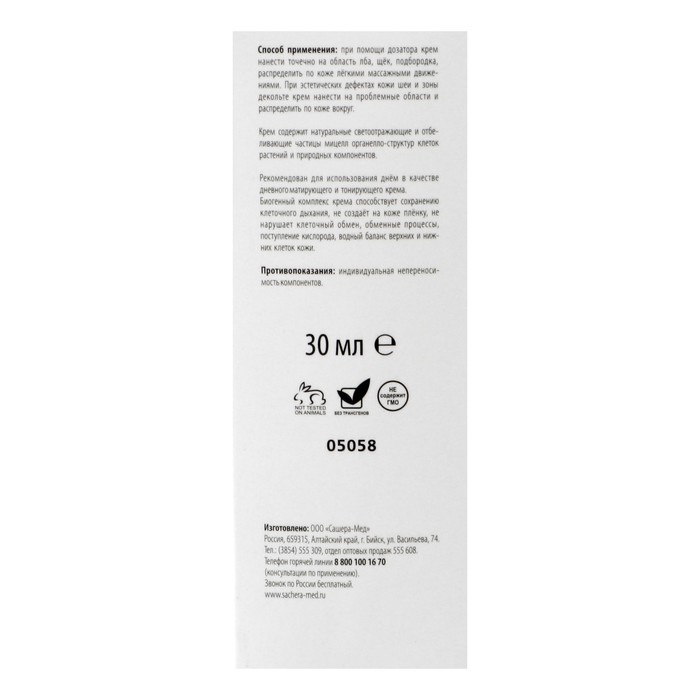 Способ применения: при помощи дозатора крем нанести точечно на область лба, щёк, подбородка, распределить по коже лёгкими массажными движениями. При эстетических дефектах кожи шеи и зоны декольте крем нанести на проблемные области и распределить по коже вокруг. Крем содержит натуральные светоотражающие и отбеливающие частицы мицелл органелло-структур клеток растений и природных компонентов. Рекомендован для использования днём в качестве дневного матирующего выравнивающего тон кожи крема.
