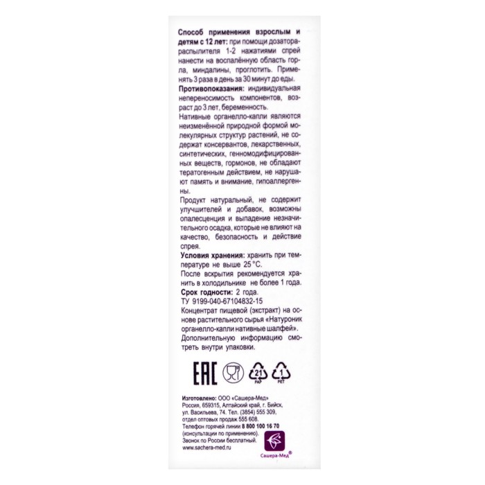 Способ применения взрослым и детям с 12 лет: при помощи дозатора-распылителя 1-2 нажатиями на распылитель спрей нанести на воспалённую область горла, миндалины, проглотить. Применять 3 раза в день. Рекомендуется приём за 30 минут до еды. Нативные микрокапли-спрей являются неизменённой природной формой молекулярных структур растений, не содержат консервантов, лекарственных, синтетических, генномодифицированных веществ, гормонов, не обладают тератогенным действием, не нарушают память и внимание, гипоаллергенны, возможно их применение детям с 1 года и беременным женщинам.