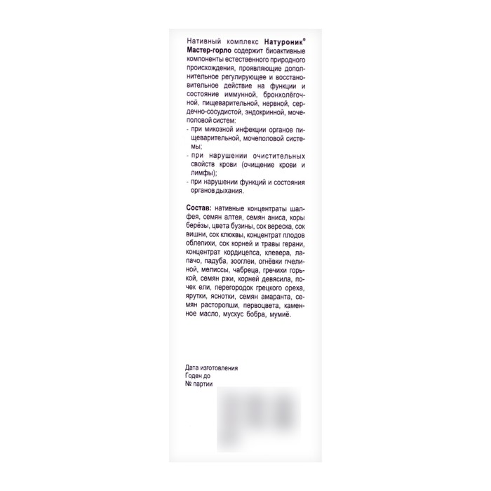 Состав: нативные концентраты шалфея, семян алтея, семян аниса, коры берёзы, цвета бузины, сок вереска, сок вишни, сок клюквы, концентрат плодов облепихи, сок корней и травы герани, концентрат кордицепса, клевера, лапачо, падуба, зооглеи, огнёвки пчелиной, мелиссы, чабреца, гречихи горькой, семян ржи, корней девясила, почек ели, перегородок грецкого ореха, ярутки, яснотки, семян амаранта, се-мян расторопши, первоцвета, каменное масло, мускус бобра, мумиё.