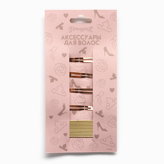 Невидимка золотистая 12 шт., 5 см, заколка клик-клак 4 шт., 5 см, набор, Принцессы