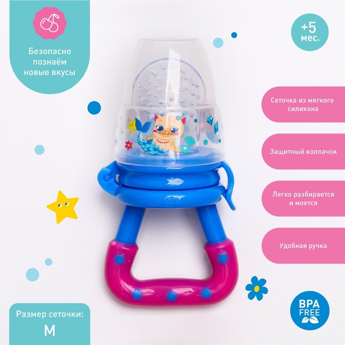 Изделие для прикорма (ниблер) пригодится в период, когда ребёнок переходит с кашки и молока на твёрдую пищу. Приспособление разовьёт у крохи жевательные навыки. Также предмет будет безопасно массировать дёсны во время прорезывания зубов.