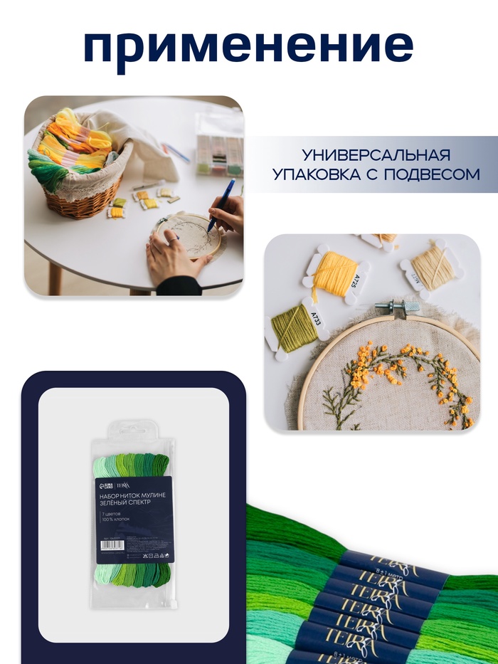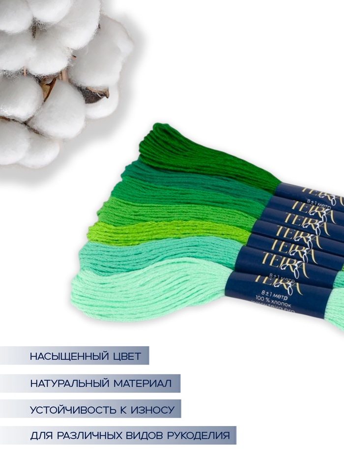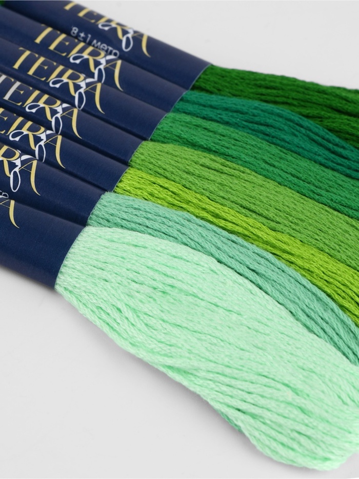 Создавайте природную гармонию в каждой детали.Зелёные хлопковые нитки мулине премиму торговой марки TEIRA — ваш выбор для работ, наполненных свежестью и естественностью. Подходят как для вышивки, так и для декоративных поделок. Идеальны для создания растительных орнаментов, пейзажей или акцентов в текстильном дизайне.