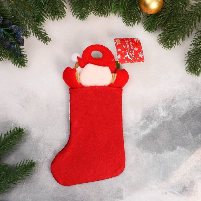 Красный праздничный носок с изображением Деда Мороза и декоративной пуговкой сочетает новогоднее барокко, скандинавский стиль и фьюжн. Его насыщенный оттенок и выразительный рисунок создают тёплую атмосферу зимних праздников и украшают интерьер.