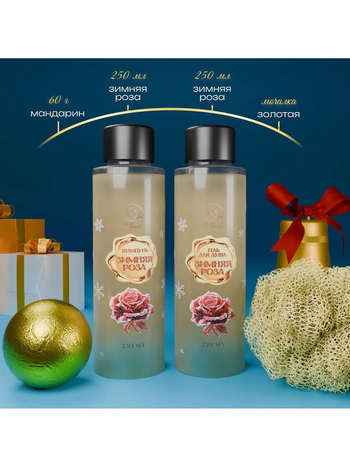 Новогодний подарочный набор косметики SB BEAUTY, шампунь, гель для душа, бомбочка, мочалка, с ароматом розы и мандарина