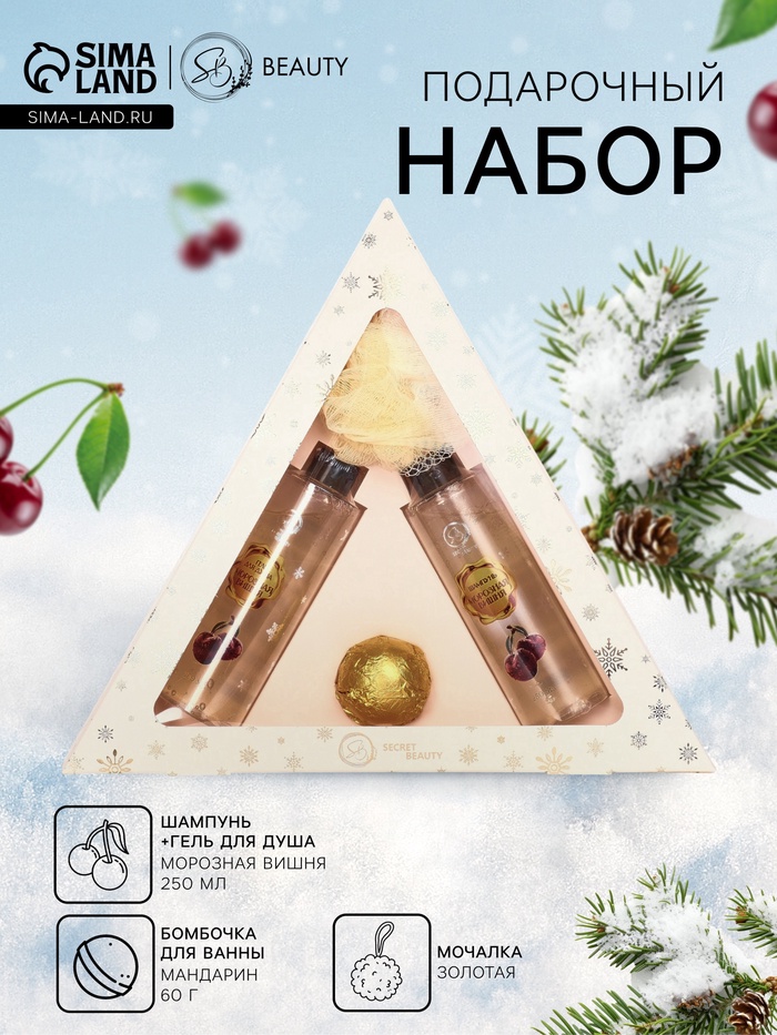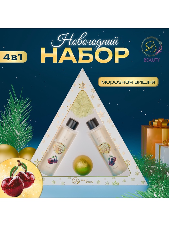 Новогодний подарочный набор косметики SB BEAUTY, шампунь, гель для душа, бомбочка, мочалка, с ароматом вишни и мандарина