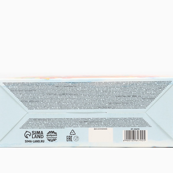 Состав: сахар, патока, масла растительные, молоко сухое обезжиренное, сыворотка молочная сухая, крахмал кукурузный, агенты влагоудерживающие (сорбитовый сироп, глицерин), желатин пищевой говяжий, соль, ароматизатор, антиокислитель – токоферолы, концентрат смеси. Содержит сорбитовый сироп. При чрезмерном употреблении может оказывать слабительное действие. Может содержать незначительное количество продуктов переработки сои, экстракта ячменно-солодового.