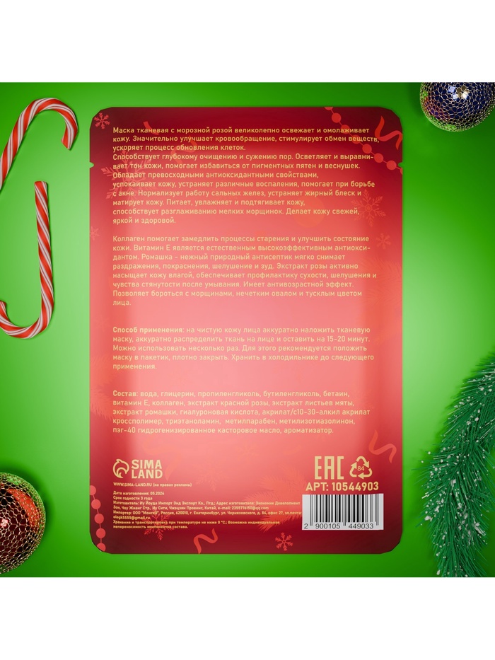 Новогодняя маска для лица, тканевая, увлажняющая — это идеальный способ побаловать себя и своих близких в Новый год. Маска создана для глубокой увлажняющей заботы о коже, обеспечивая ей интенсивное питание и свежесть. Тканевая основа плотно прилегает к коже, позволяя активным ингредиентам проникать и работать эффективно.