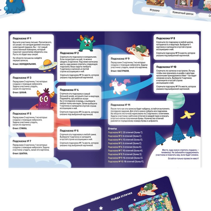 Перед вами игра, с которой поиск подарка станет незабываемым приключением! А продуманный сюжет и подсказки помогут вам в этом. Возьмите немного фантазии и щепотку воображения, остальное сделает наша игра.