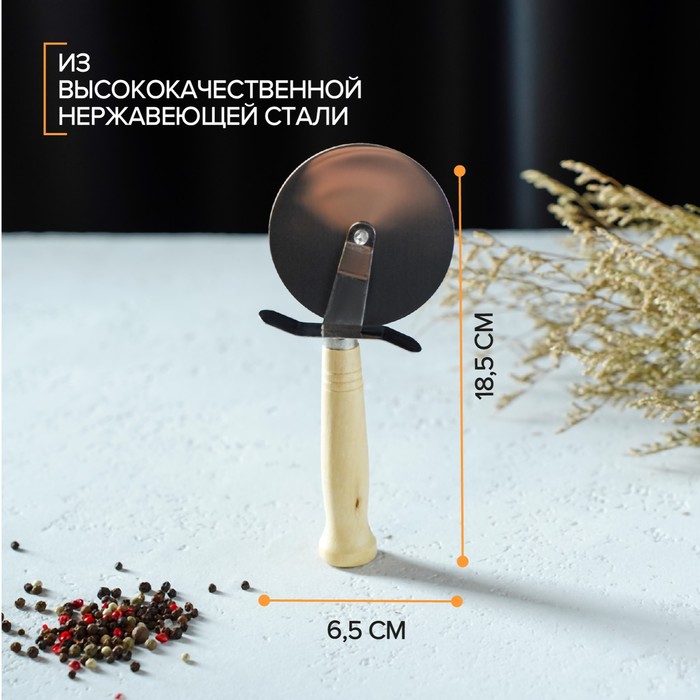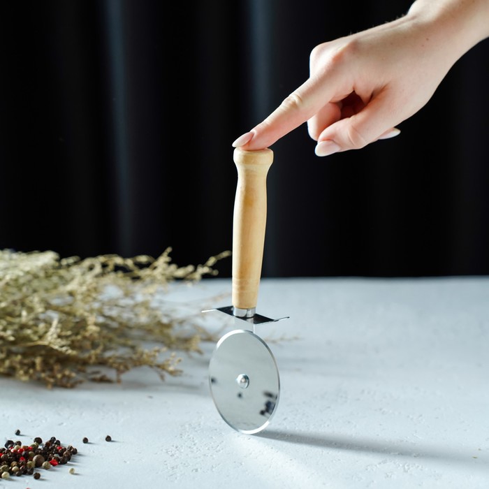 Нож для пиццы — универсальный кухонный инструмент, который не только легко разрезает готовую выпечку, но и помогает поделить на слайсы липкое тесто. Нож имеет эргономичную форму ручки и острое круглое лезвие. Колесо, прикреплённое к рукояти, продавливает продукт, а не разрезает его в отличие от классического ножа. Благодаря такому способу тесто разрезается, а начинка остается на месте.