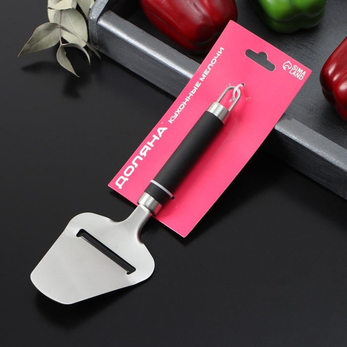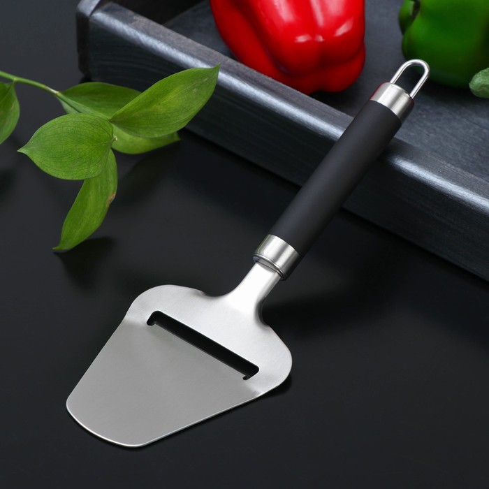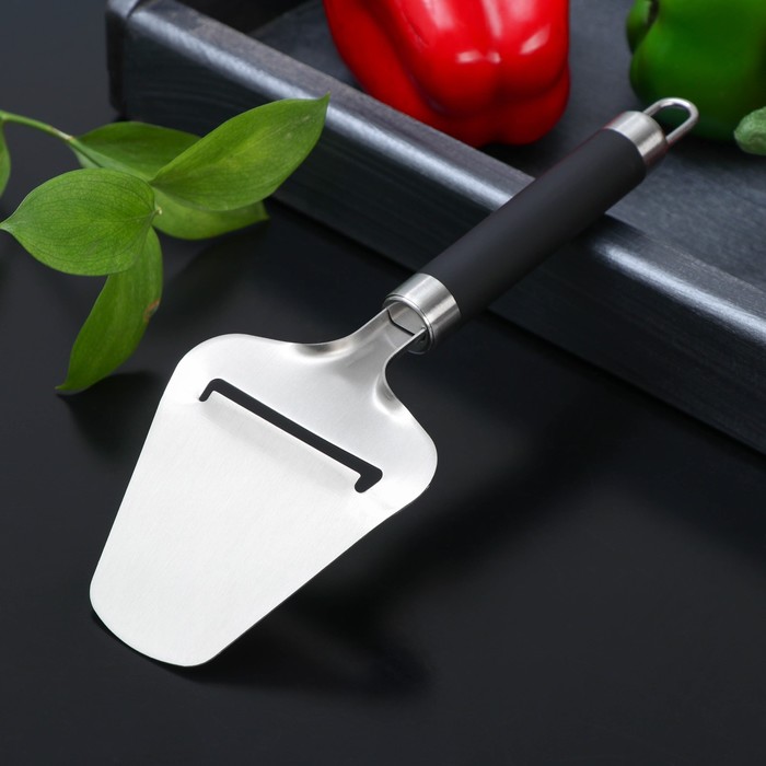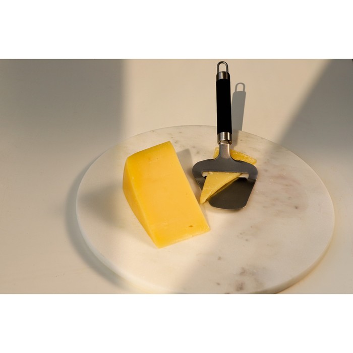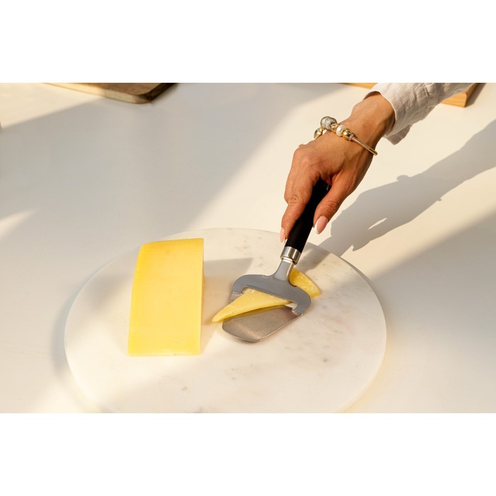 Нож Venus изготовлен из высококачественной нержавеющей стали, что делает его прочным и долговечным. Острое лезвие с гладкой поверхностью легко проходит через сыр, не мняя и не ломая его. Удобная пластиковая ручка с черным матовым покрытием обеспечивает комфортный и безопасный хват, не скользит в руке и придает ножу стильный вид.