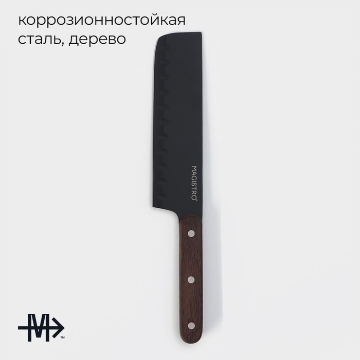 Нож Сантоку Dark wood - это универсальный кухонный нож, который идеально подходит для приготовления широкого спектра блюд. Он имеет особую форму лезвия с широким основанием и тонким кончиком, что позволяет ему быть более эффективным и удобным в использовании, чем другие типы ножей.