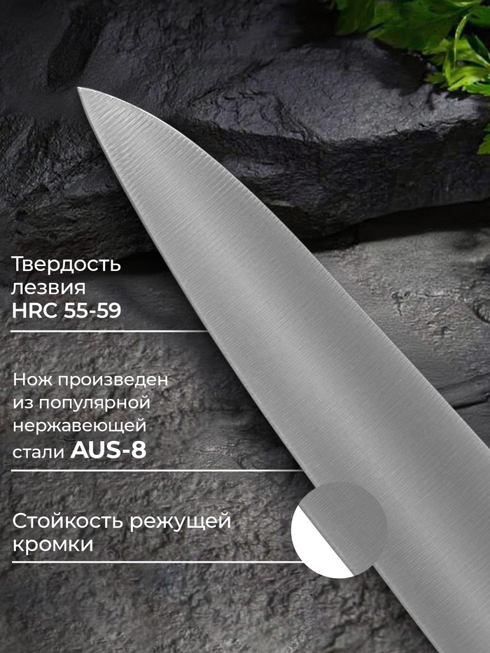 - Оптимальная длина: лезвие длиной 15,7 см идеально подходит для нарезки мяса, овощей, фруктов, хлеба и других продуктов.