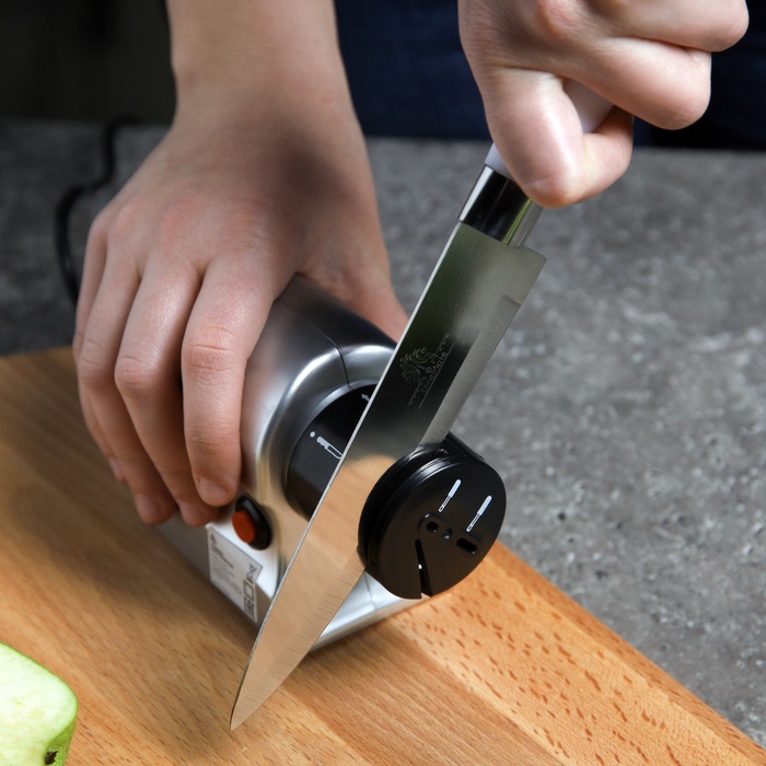 Электрическая точилка LuazON подходит для заточки и восстановления кромки всех типов ножей, ножниц и отвёрток, кроме ножей с покрытием. Просто включите прибор, вставьте лезвие ножа в прорезь для заточки и медленно проводите его через прорезь точилки в направлении от ручки ножа к кончику лезвия в течение 4‒6 секунд.