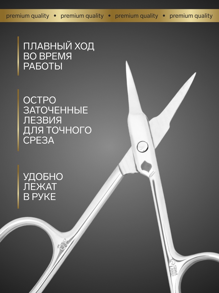 Маникюрные ножницы серии Premium от Queen fair изготовлены из высококачественной нержавеющей стали. Инструмент имеет особенно тонкие, острые и хорошо отполированные лезвия. Острыми кончиками ножниц можно аккуратно и бережно удалить кутикулу, не травмируя кожу. Лезвия позволяют ровно срезать заусенцы без повреждений и ранок. Ножницы имеют очень плавный ход, поэтому подходят для профессионального использования мастерами по маникюру и для домашнего ухода.