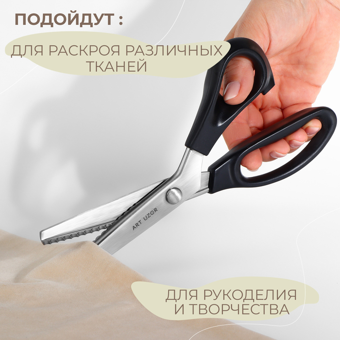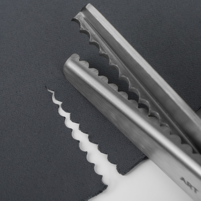 Инструмент легко режет ткань, не заминая и не деформируя её, и образует аккуратный фигурный край. Ножницы изготовлены из нержавеющей стали, имеют эргономичные пластиковые ручки.