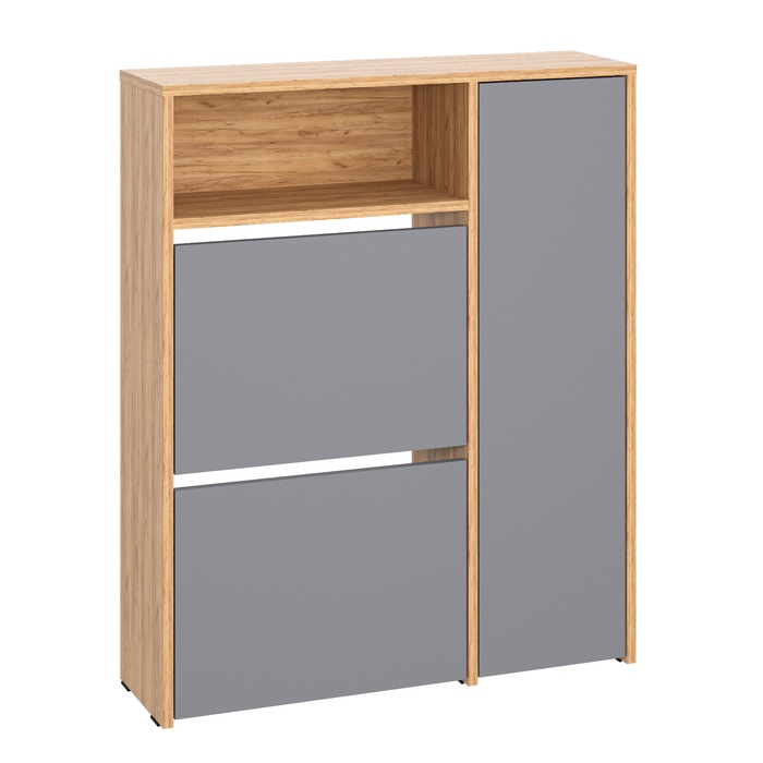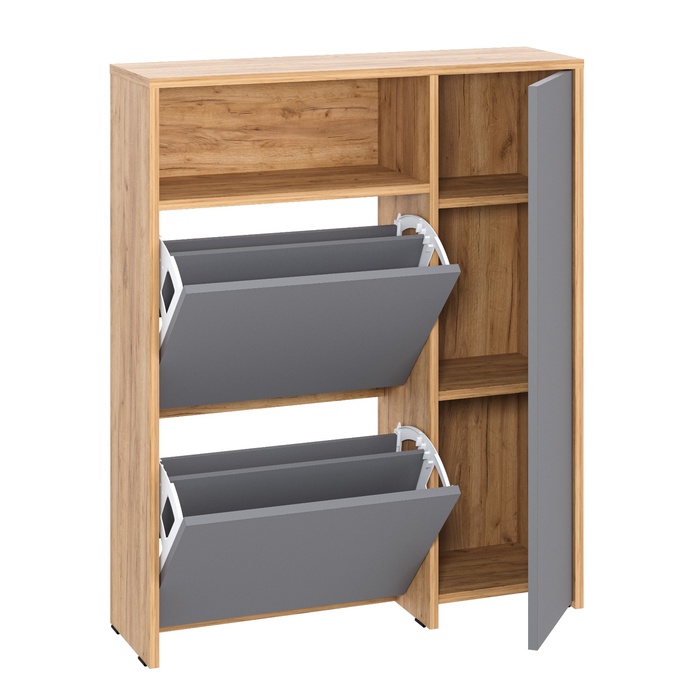 - Универсальность: одна секция с двумя ящиками идеально подходит для небольшой обуви, другая с дверкой и полками — для крупной обуви или коробок.