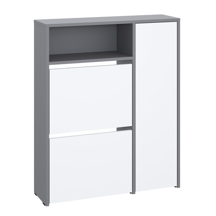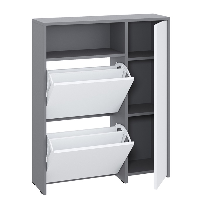 - Универсальность: одна секция с двумя ящиками идеально подходит для небольшой обуви, другая с дверкой и полками — для крупной обуви или коробок.