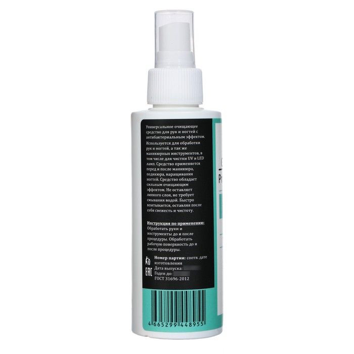 Средство используется для обработки рук и ногтей, а также маникюрных инструментов, в том числе для чистки UV и LED ламп. Средство применяется перед и после маникюра, педикюра, наращивания ногтей. Средство обладает сильным очищающим эффектом. Не оставляет липкого слоя, не требует смывания водой. Быстро впитывается, оставляя после себя свежесть и чистоту.