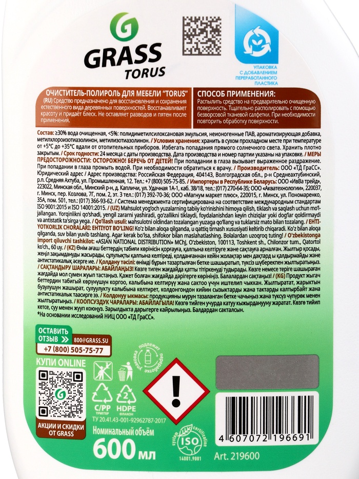 Специальное средство Torus предназначено для восстановления и сохранения естественного вида деревянных поверхностей. Очищает от пыли, разводов, пятен, обладает антистатическим эффектом. Благодаря маслу авокадо защищает мебель и придает блеск. Позволяет улучшить внешний вид, скрывает легкие повреждения.