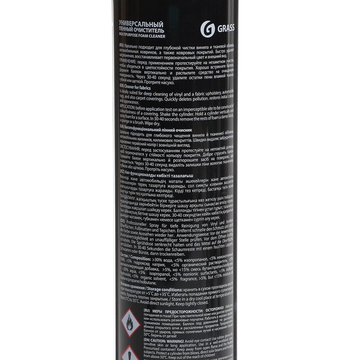 Способ применения: Перед применением протестируйте на незаметном участке, чтобы убедиться в цветостойкости покрытия. Хорошо встряхните баллон. Держите баллон вертикально и распылите средство на очищаемую поверхность. Через 30-40 секунд удалите остатки пены влажной тканью, губкой или щеткой. Протрите насухо.