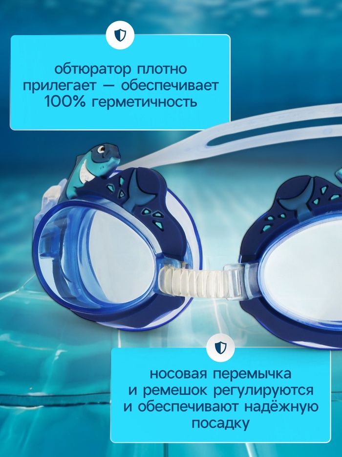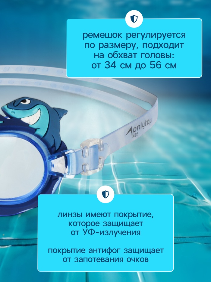 Линзы очков изготовлены из поликарбоната, имеют покрытие от УФ-излучения для защиты глаз ребёнка. Покрытие антифог защищает от запотевания очков. Мягкий и комфортный уплотнитель обеспечивает герметичность во время плавания. Носовая перемычка и ремешок регулируется и обеспечивают надёжную посадку .