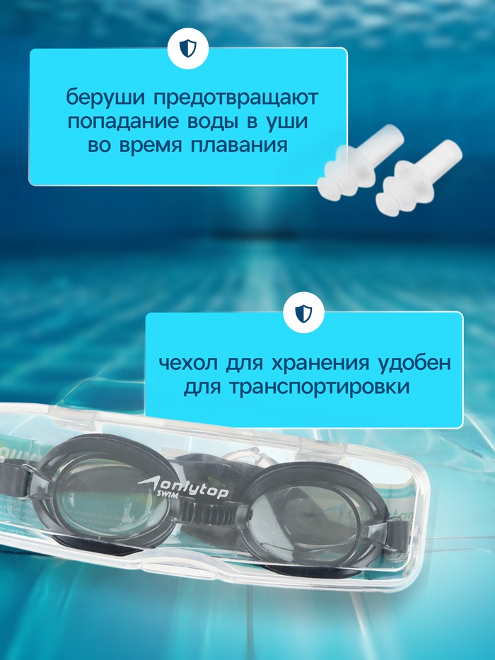 Очки для плавания защищают глаза от попадания воды. В них ребёнок будет с лёгкостью ориентироваться под водой. В комплект входят беруши — они плотно закрывают уши во время занятий в бассейне.