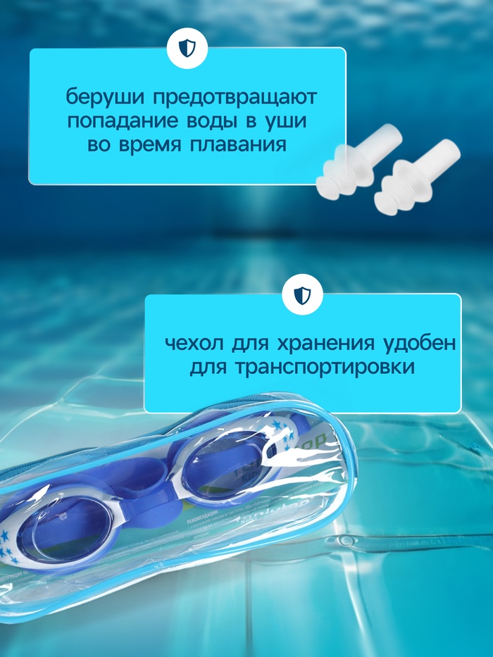 Очки для плавания защищают глаза от попадания хлорки. В них вы будете с лёгкостью ориентироваться под водой с открытыми глазами. Беруши в комплекте плотно закрывают уши во время занятий в бассейне.