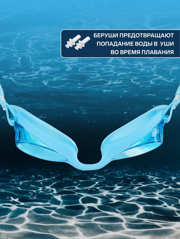 Очки для плавания защищают глаза от попадания хлорки. В них вы будете с лёгкостью ориентироваться под водой с открытыми глазами. Беруши в комплекте плотно закрывают уши во время занятий в бассейне.