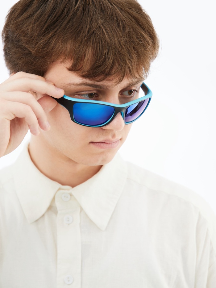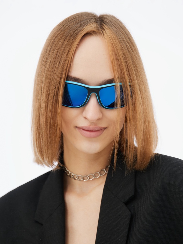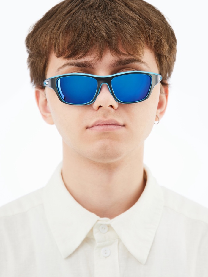 Очки имеют полноободковую оправу голубого цвета, выполненную из легкого и прочного пластика. Ширина 13.9 см и длина дужек 12.3 см обеспечивают отличную посадку и комфорт при носке. Синие линзы с градиентом не только добавляют стильный акцент, но и помогают уменьшить яркость солнечного света, что делает их идеальными для спорта и активного отдыха.