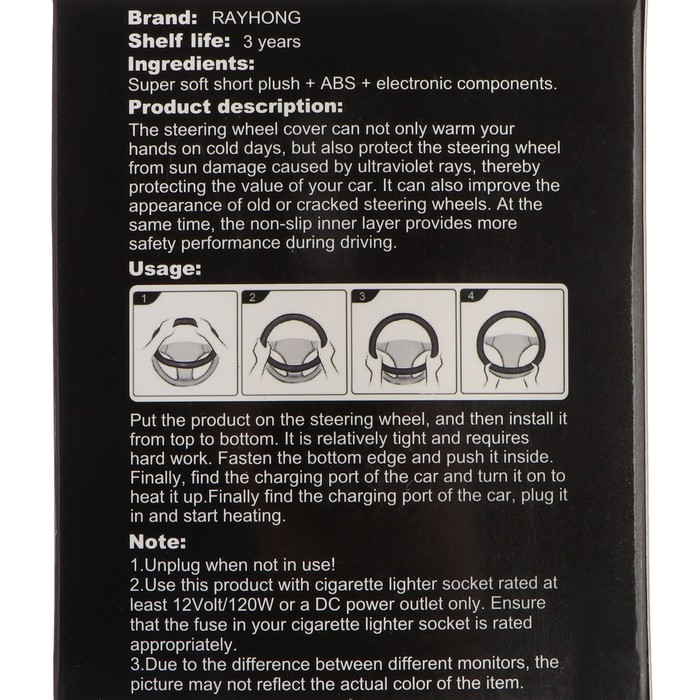 Зимой в сильные морозы не очень приятно держать руль в промерзшей машине голыми руками и китайцы нашли решение: съемный чехол-подогрев руля. Конструкция незамысловата: чехол внутри которого размещен нагреватель. Внутри прорезинен, что препятствует скольжению по рулевому колесу. Шнур электропитания разъемный, поэтому не мешает рулить. Включается в прикуриватель. Чехол приятный на ощупь из флизелинового материала.
