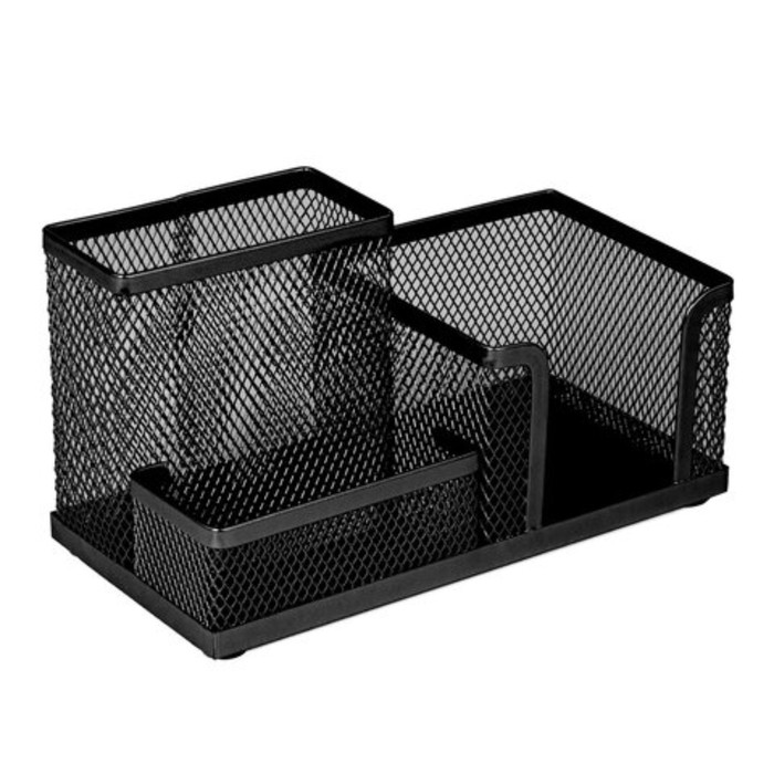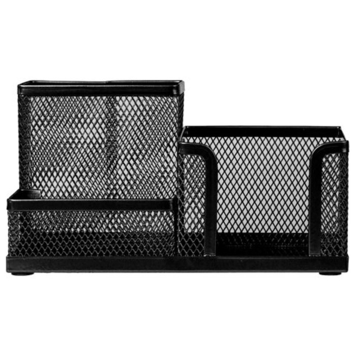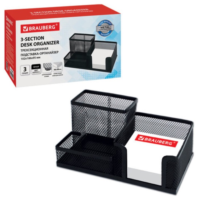 Практичная металлическая подставка-органайзер BRAUBERG "Germanium" для хранения различных канцелярских принадлежностей. Изготовлена из металлической сетки. Имеет размеры 102х186х95 мм. Состоит из 3-х отделений: одного для бумажного блока размером 90х90 мм и двух - для пишущих принадлежностей и канцелярских мелочей. Мягкие подушечки на дне предотвращают скольжение и порчу мебели. Подставка-органайзер упакована в фирменную коробку. Поставляется без канцелярского наполнения.