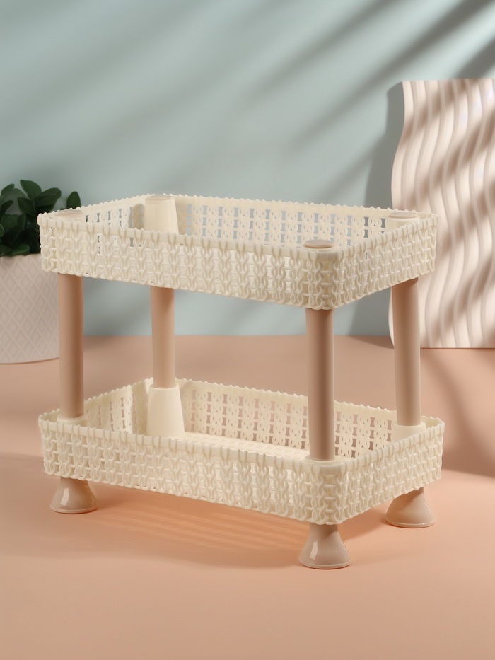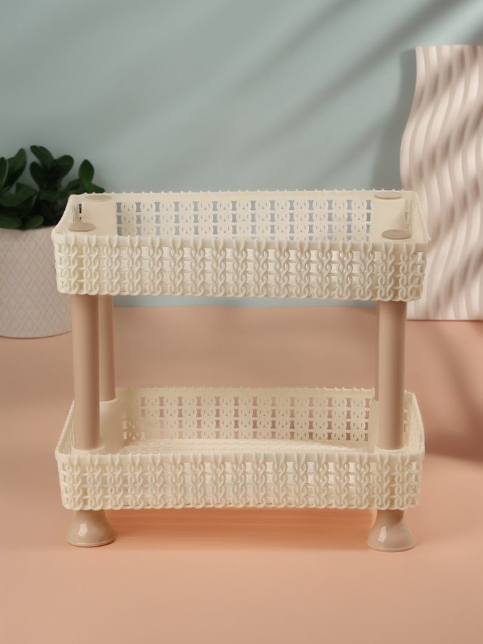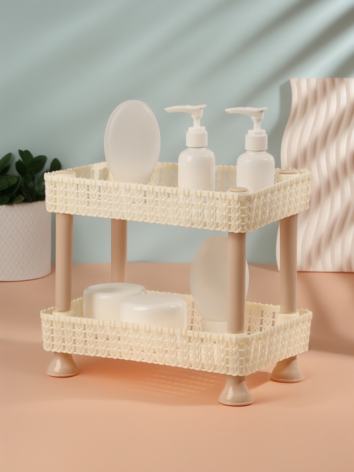 Органайзер изготовлен из прочного пластика, который не имеет неприятного запаха и устойчив к внешним воздействиям. Два уровня позволяют удобно распределять косметику, аксессуары и другие мелочи: нижний ярус идеален для крупных предметов, а верхний — для более мелких принадлежностей, таких как кисти, флаконы или тюбики.
