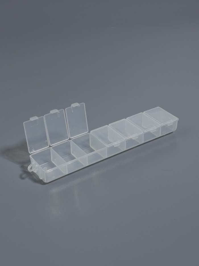 Компактный органайзер с подвесом — практичное решение для хранения мелких предметов в доме, мастерской или на рабочем столе. В комплекте два блока по 7 ячеек каждый — достаточно вместительности для страз, пуговиц, бусин и других мелочей. Прозрачный пластик позволяет видеть содержимое без открытия, а тонкие габариты — 15,2×3,2×1,8 см — делают его удобным для размещения даже в ограниченном пространстве.
