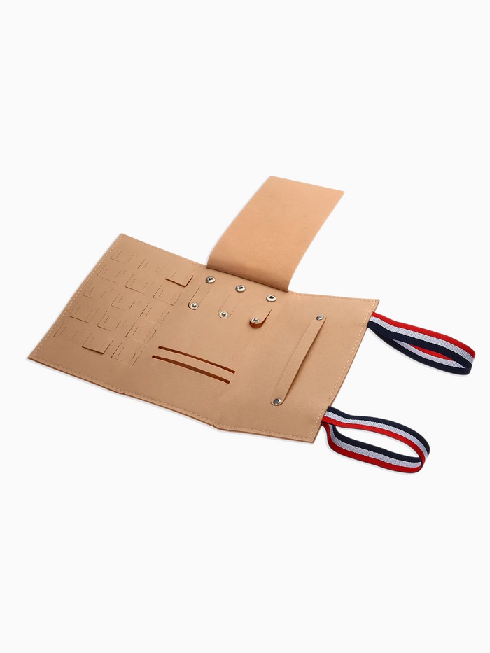 Изготовленный из мягкого текстиля с универсальным полосатым узором, органайзер отличается лёгкостью и практичностью. Благодаря тонкому профилю в 1 см и возможности скручивания, он занимает минимум места в сумке или чемодане — идеальный спутник для путешествий и повседневного использования.