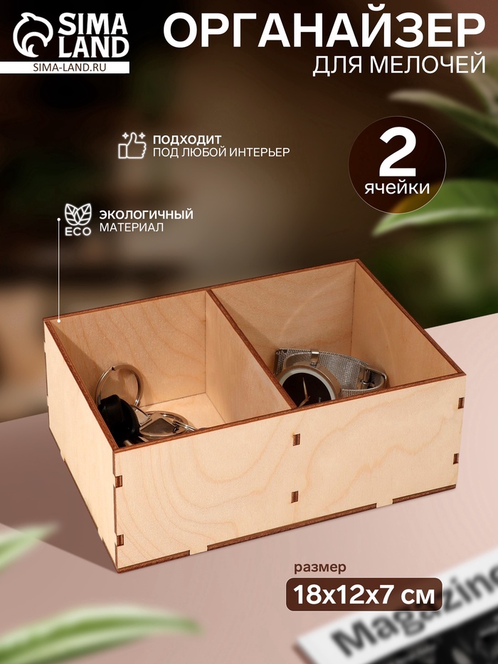 Органайзер для мелочей с двумя ячейками, размер 18×12×7 см, выполненный из фанеры, цвет бежевый — это практичное и стильное решение для хранения небольших предметов, таких как канцелярия, косметика или другие аксессуары. Его компактные размеры позволяют разместить органайзер на рабочем столе, полке или в ящике, не занимая много места.