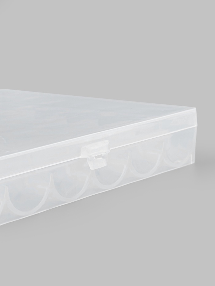 Разместите шпульки с нитками в ячейках — так вы сразу увидите весь ассортимент. Благодаря прозрачности, можно быстро найти нужный цвет без открывания крышки. Компактная форма позволяет брать органайзер с собой на курсы или в поездки.