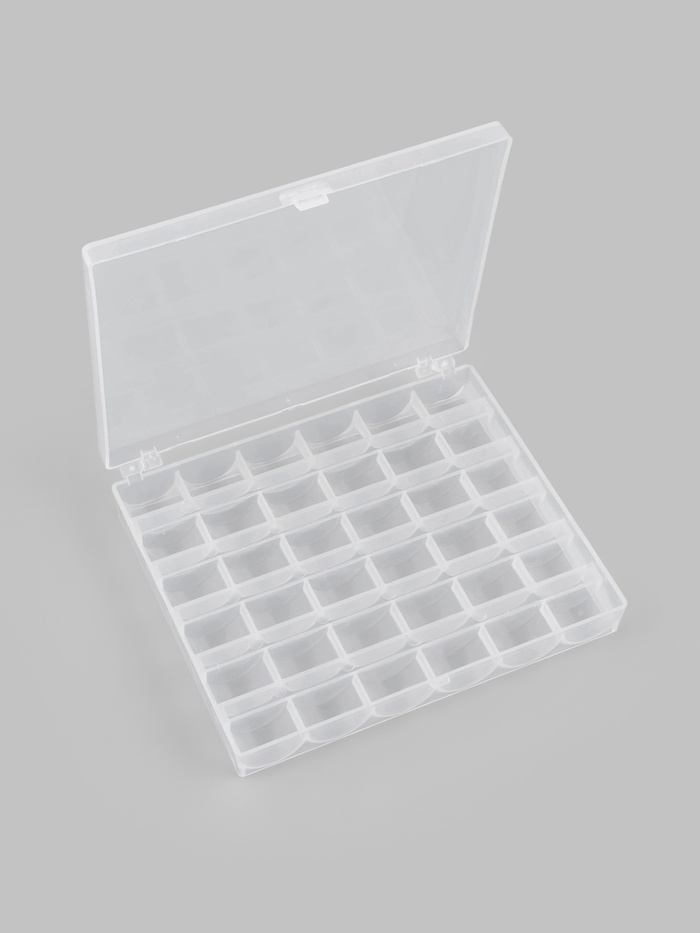 Прозрачный пластиковый органайзер на 36 шпулек — удобное решение для хранения ниток и поддержания порядка в рабочем пространстве. Компактные размеры 14.5×12×2.5 см позволяют разместить его на столе или в шкафу, сохраняя при этом быстрый доступ ко всем материалам.