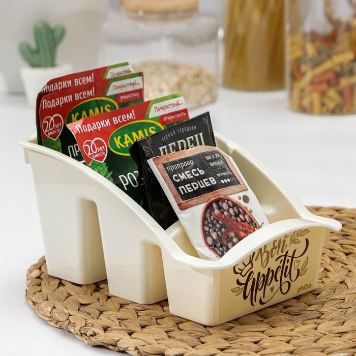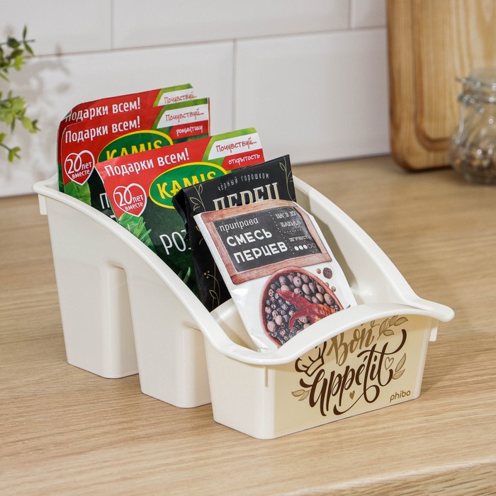 Органайзер для хранения специй, приправ и пряностей позволяет отсортировать пакетики со специями. Благодаря этому легко найти искомый пакет и поддерживать порядок в кухонном шкафу. Стенки лотка снабжены высокими бортиками. Практичный органайзер пригодится в любом хозяйстве и поможет аккуратно хранить все приправы в одном месте. Размер корзинки выверен под стандартный размер пакетика со специями, которые в большинстве своем представлены на полках магазинов, а потому отделения идеально подходят для их устойчивого хранения. Одновременно такой органайзер не занимает много места и поместится на любой кухонной полочке.