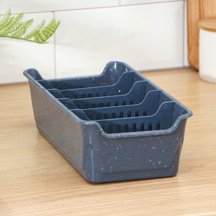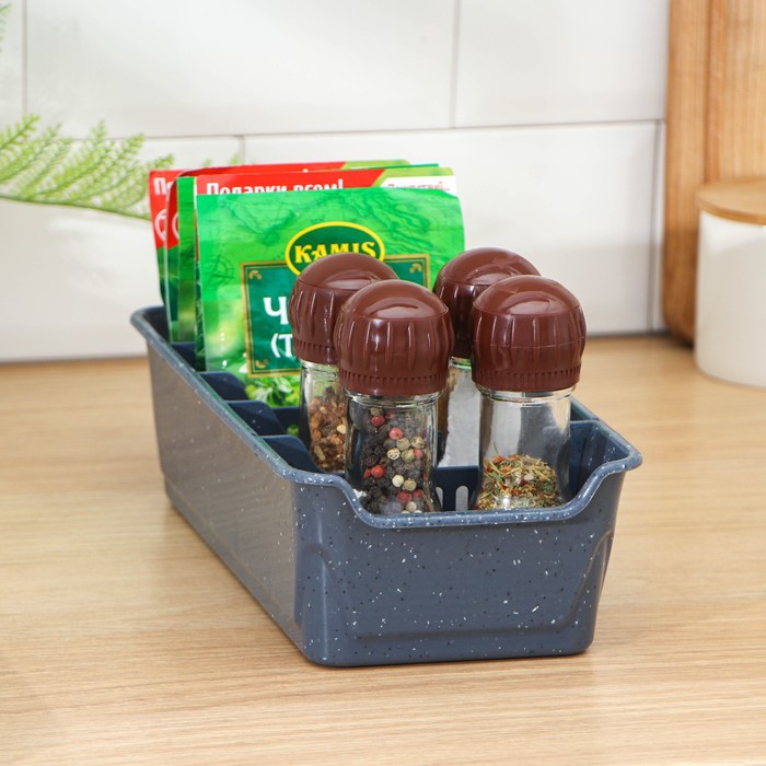Органайзер для хранения специй, приправ и пряностей позволяет отсортировать пакетики со специями. Благодаря этому легко найти искомый пакет и поддерживать порядок в кухонном шкафу. Стенки лотка снабжены высокими бортиками. Практичный органайзер пригодится в любом хозяйстве и поможет аккуратно хранить все приправы в одном месте. Размер корзинки выверен под стандартный размер пакетика со специями, которые в большинстве своем представлены на полках магазинов, а потому отделения идеально подходят для их устойчивого хранения. Одновременно такой органайзер не занимает много места и поместится на любой кухонной полочке.