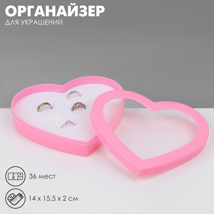 Если вы занимаетесь реализацией разнообразных украшений и аксессуаров, то вам нужно наглядно продемонстрировать свой товар, представив его в лучшем виде. Органайзер для украшений "Шкатулка сердце" 36 мест, пластик, 14*15,5*2 см, цвет розовый как нельзя лучше справится с этой задачей! У каждого украшения появится своё место, откуда его можно будет хорошо рассмотреть.