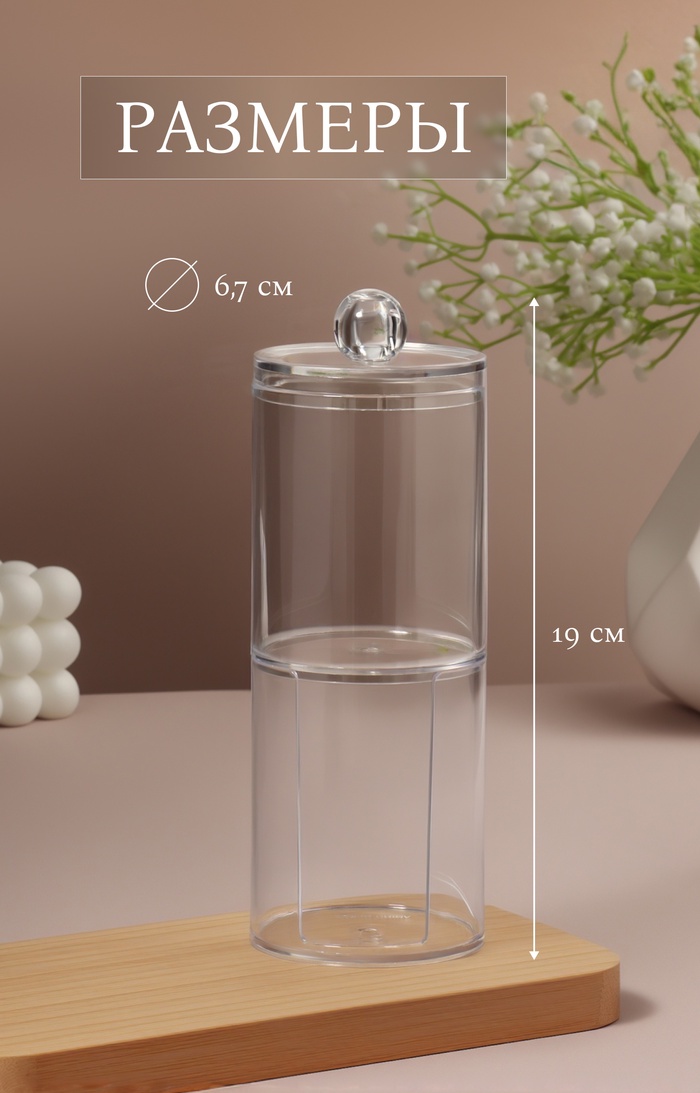 Контейнер прозрачный, поэтому локанично впишется в любой интерьер, а Вы всегда будете видеть, сколько осталось ватных дисков и палочек. Сделан контейнер из пластика. Сверху органайзер плотно закрываются крышкой, которая защищает содержимое емкости от пыли и брызг воды.