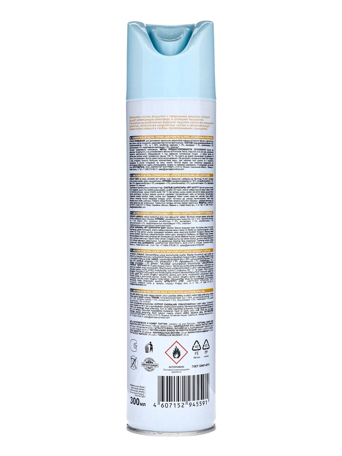 Способ применения: для получения наилучшего результата хорошо встряхнуть и держа баллончик вертикально, распылить вверх ближе к центру помещения.