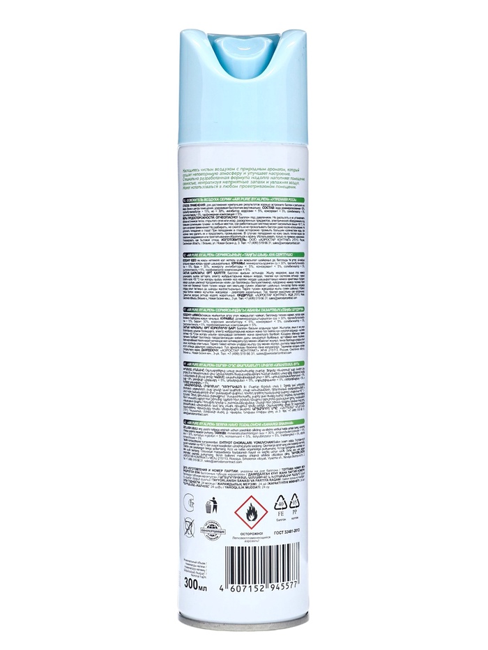 Способ применения: для получения наилучшего результата хорошо встряхнуть и держа баллончик вертикально, распылить вверх ближе к центру помещения.