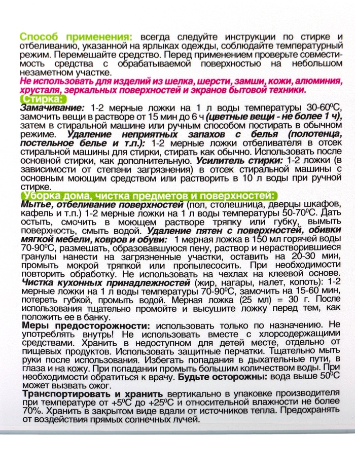 Отбеливатель пятновыводитель эффективно удаляет загрязнения с различных тканей. Входящие в его состав особые компоненты глубоко проникают в любые бытовые пятна и выводят их. Пенящееся средство устраняет неприятные запахи и дарит свежесть, не разрушает и не портит ткань. При стирке используйте резиновые перчатки. Не допускайте контакта с глазами, кожей и одеждой. При попадании пятновыводителя в глаза промойте их большим количеством воды и обратитесь к врачу, показав этикетку средства. При наличии контактных линз немедленно удалите их и продолжайте промывать глаза.