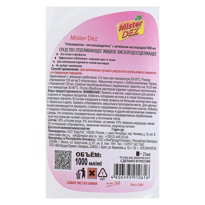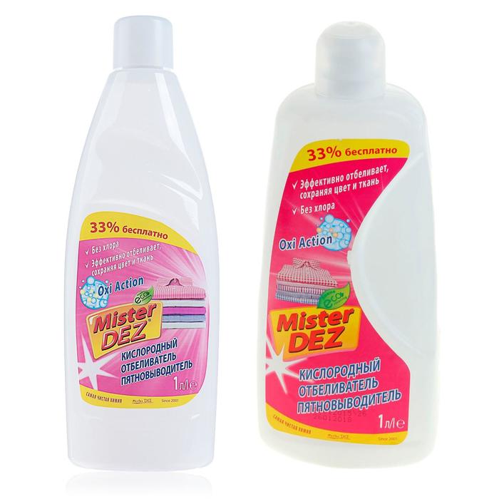 Отбеливатель-пятновыводитель Mister Dez не содержит хлора и фосфатов. Эффективно отбеливает, сохраняет цвет и ткань. Удаляет неприятные запахи, справляется с любыми загрязнениями. Формула отбеливателя бережно выводит пятна из тканей всех видов: шерсти, шёлка, вискозы, хлопка. Не вызывает коррозии барабанов, не требует кипячения. Отбеливатели от Mister Dez пригодятся каждой хозяйки! Состав: вода,анионный ПАВ- менее 5%, стабилизатор.