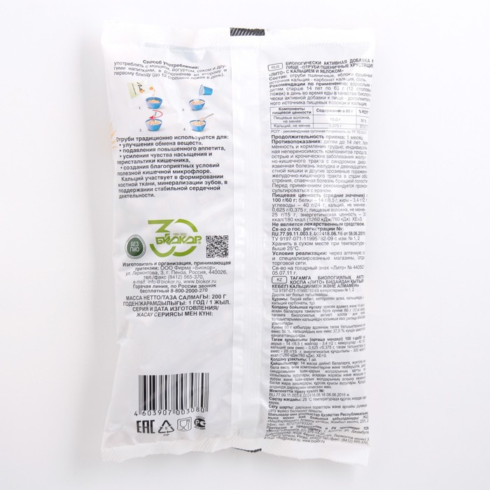 Кальций, входящий в состав продукта, активно участвует в формировании костной ткани, минерализации зубов и поддержании стабильной сердечной деятельности. Для улучшения вкуса и повышения биологической ценности в отруби добавлены сушеные яблоки, которые поставляют растворимую клетчатку и биологически активные вещества, позволяя оптимизировать питание даже при отсутствии в рационе свежих овощей и фруктов. Яблоки являются источником пектина – растворимой клетчатки, одним из лучших естественных средств оздоровления кишечника и кровеносных сосудов. В яблоках содержатся такие важные природные кислоты, как яблочная, винная и лимонная, которые останавливают процессы гниения и брожения в кишечнике, дают возможность не чувствовать метеоризма, вздутия живота, способствуют природному очищению и восстановлению кишечника. Все злаки, используемые при производстве отрубей «ЛИТО», выращены на полях в Пензенской области под контролем профессиональных агрономов, что гарантирует высокое качество и натуральность продукта.