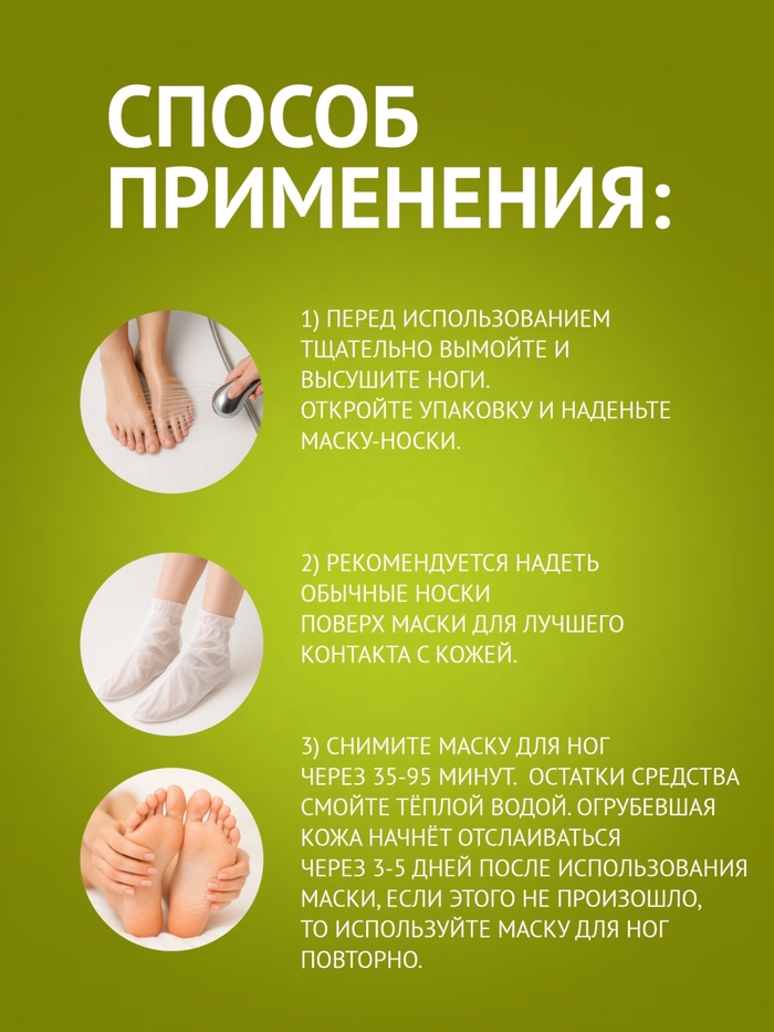 - Снимите маску для ног через 35-95 минут. Остатки средства смойте тёплой водой. Огрубевшая кожа начнет отслаиваться через 3-5 дней после использования маски, если этого не произошло, то используйте маску для ног повторно.