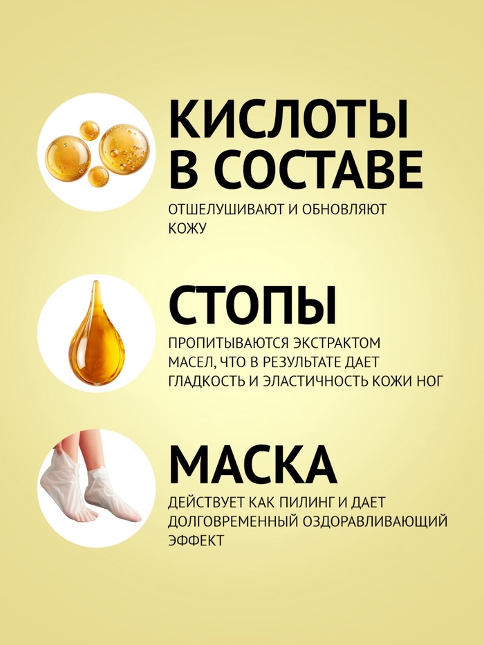 - Маска-носки мягко удаляют ороговевшие клетки кожи, способствуя её обновлению и улучшая текстуру стоп.