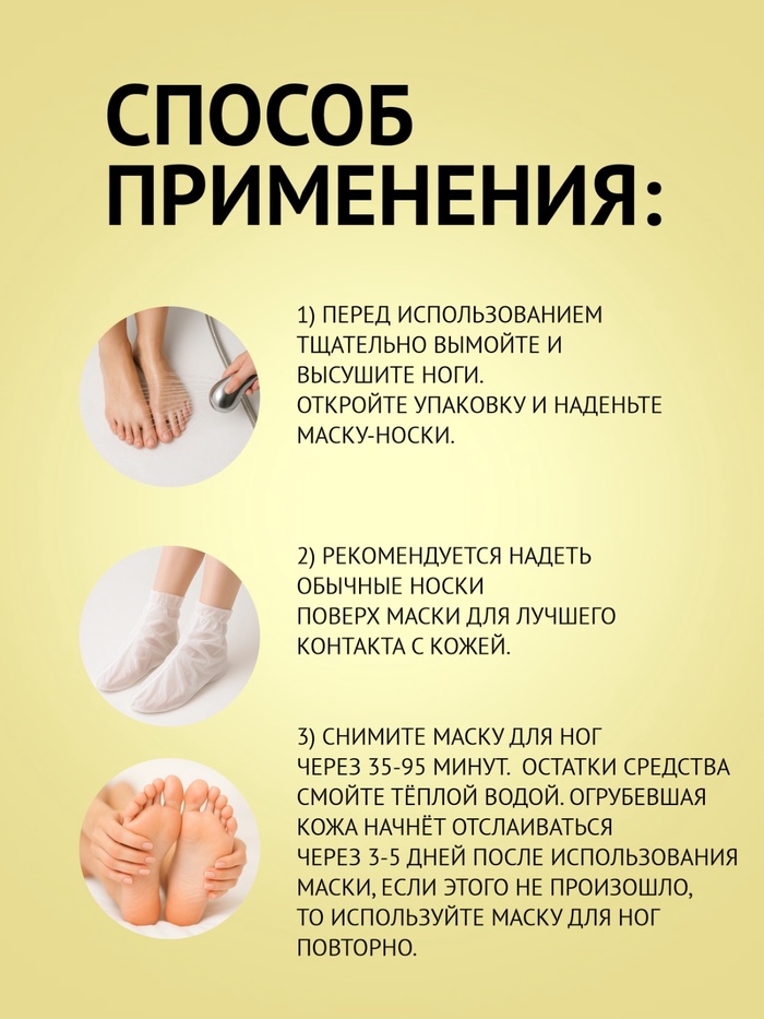 Способ применения: тщательно вымойте и высушите ноги. Наденьте маску-носки на ноги. Оставьте маску на 35-95 минут. Снимите носки и смойте остатки средства тёплой водой. В течение следующих дней кожа начнёт шелушиться, обновляясь и становясь более мягкой.