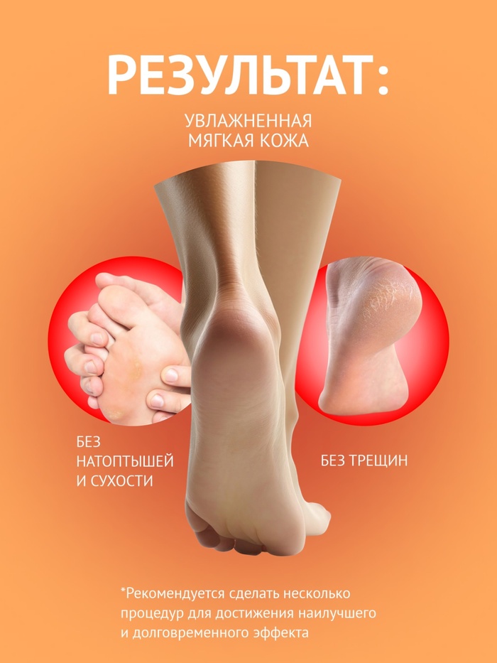 Маска отлично удаляет мозоли, натоптыши и огрубевшую кожу стоп, трещины на стопах в течение 2-х недель. Стимулирует обменные процессы, улучшает эластичность и упругость кожи. Регулирует деятельность потовых желёз.